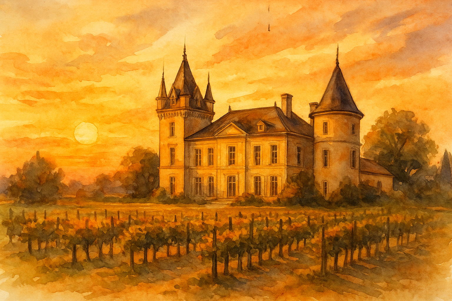 A chateau and vineyard at sunset in the Bordeaux region of France