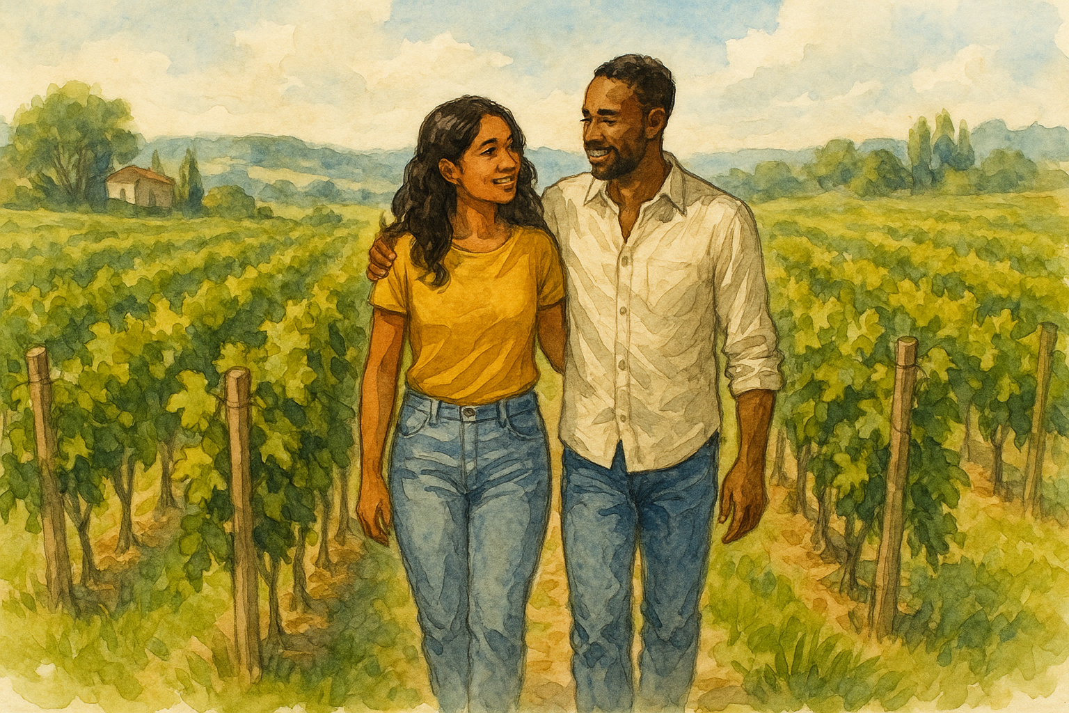 A couple walks with their arms around each other through a vineyard in Bordeaux, France