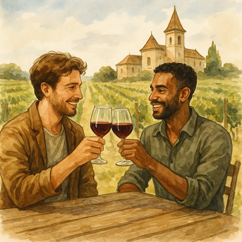 A gay couple toasts red wine glasses at a table by a vineyard in Bordeaux, France, with a chateau in the background