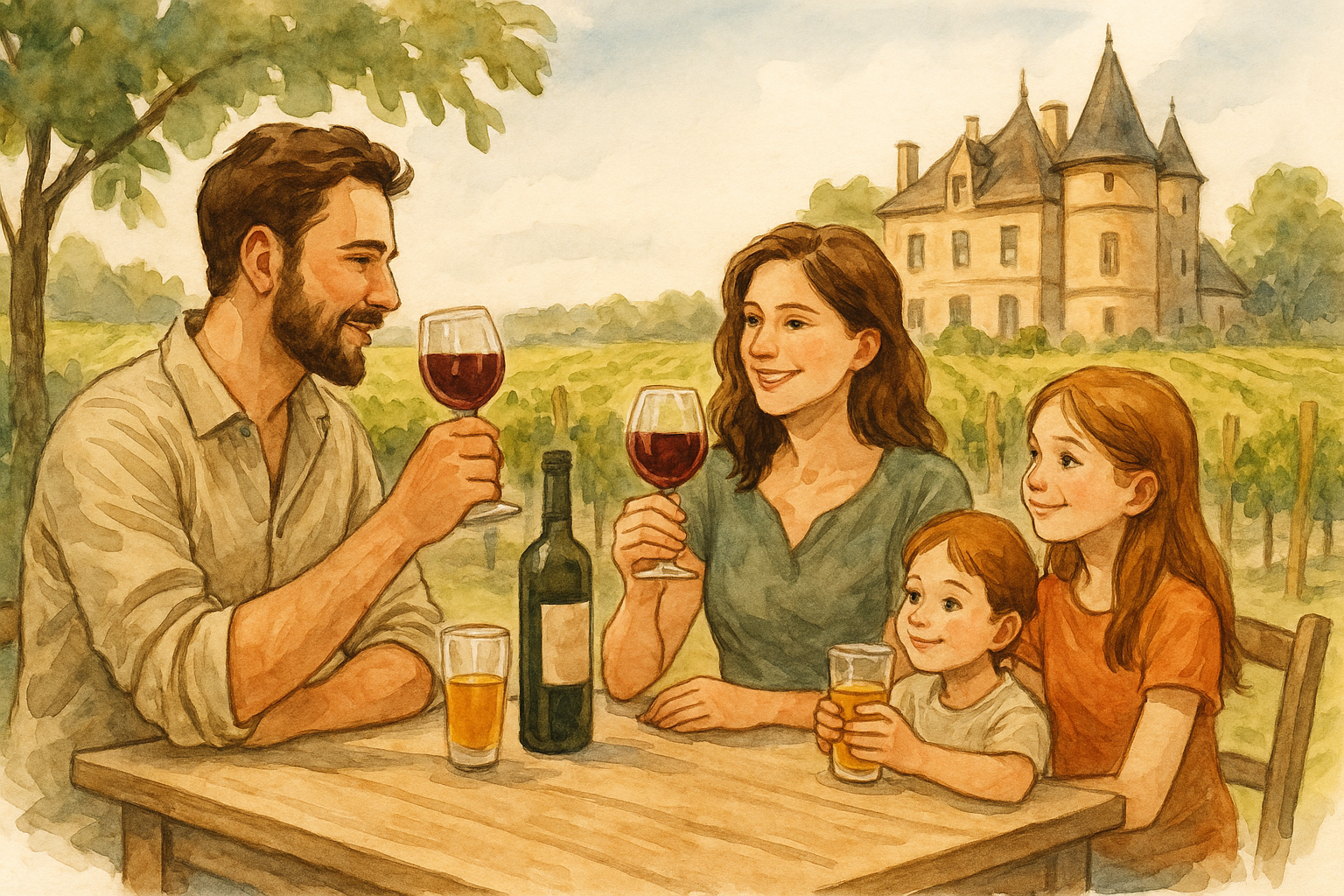 A family drinks wine and cider at a table in Bordeaux, France, by a vineyard and chateau