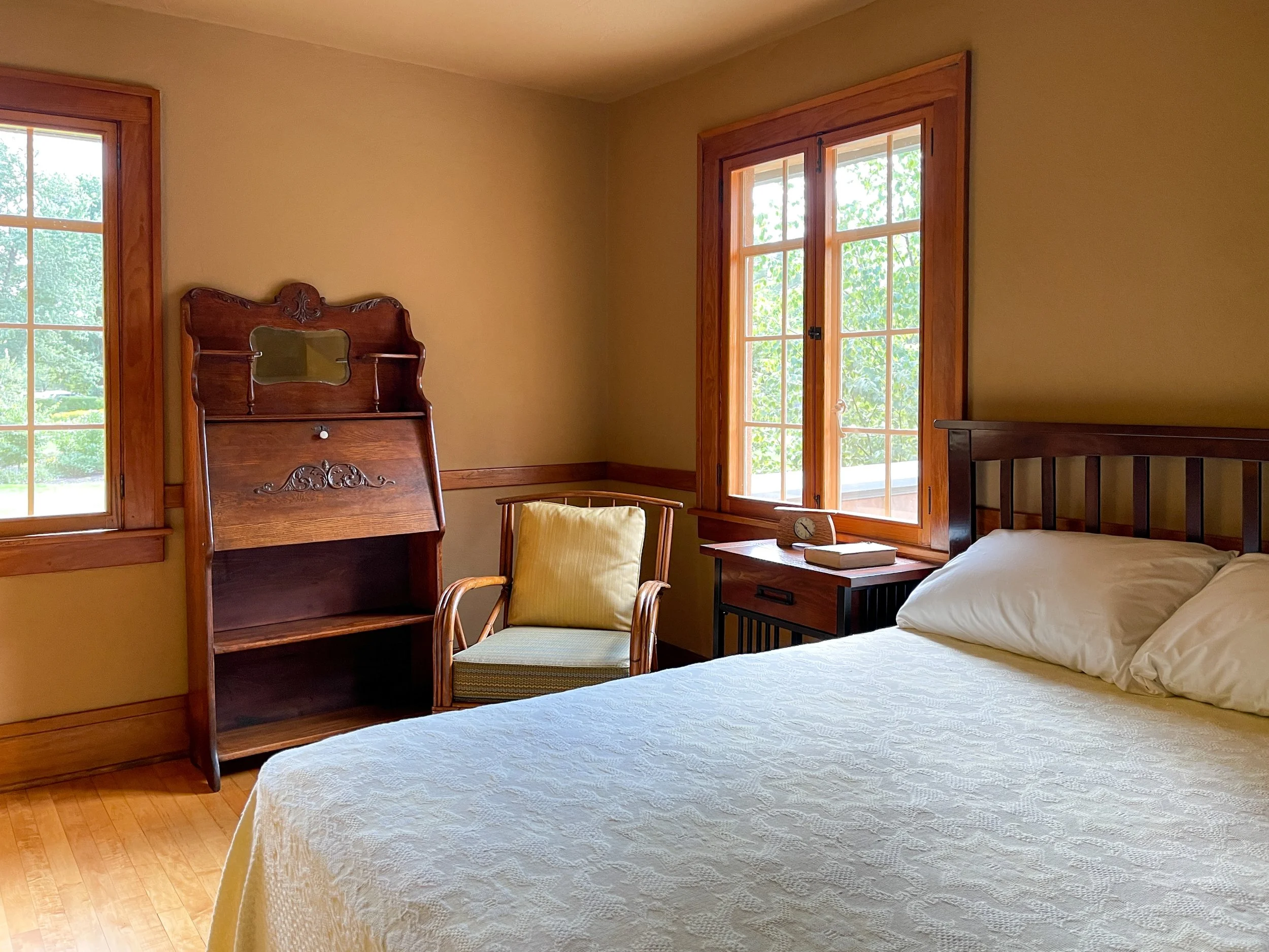 At the front of the room, floor-to-ceiling windows brought in natural light and made the space feel larger. Thanks to the height and placement of the front porch, anyone seated inside could enjoy a sense of openness and connection with the outdoors while still maintaining a sense of privacy, as the porch blocks direct views from passersby.