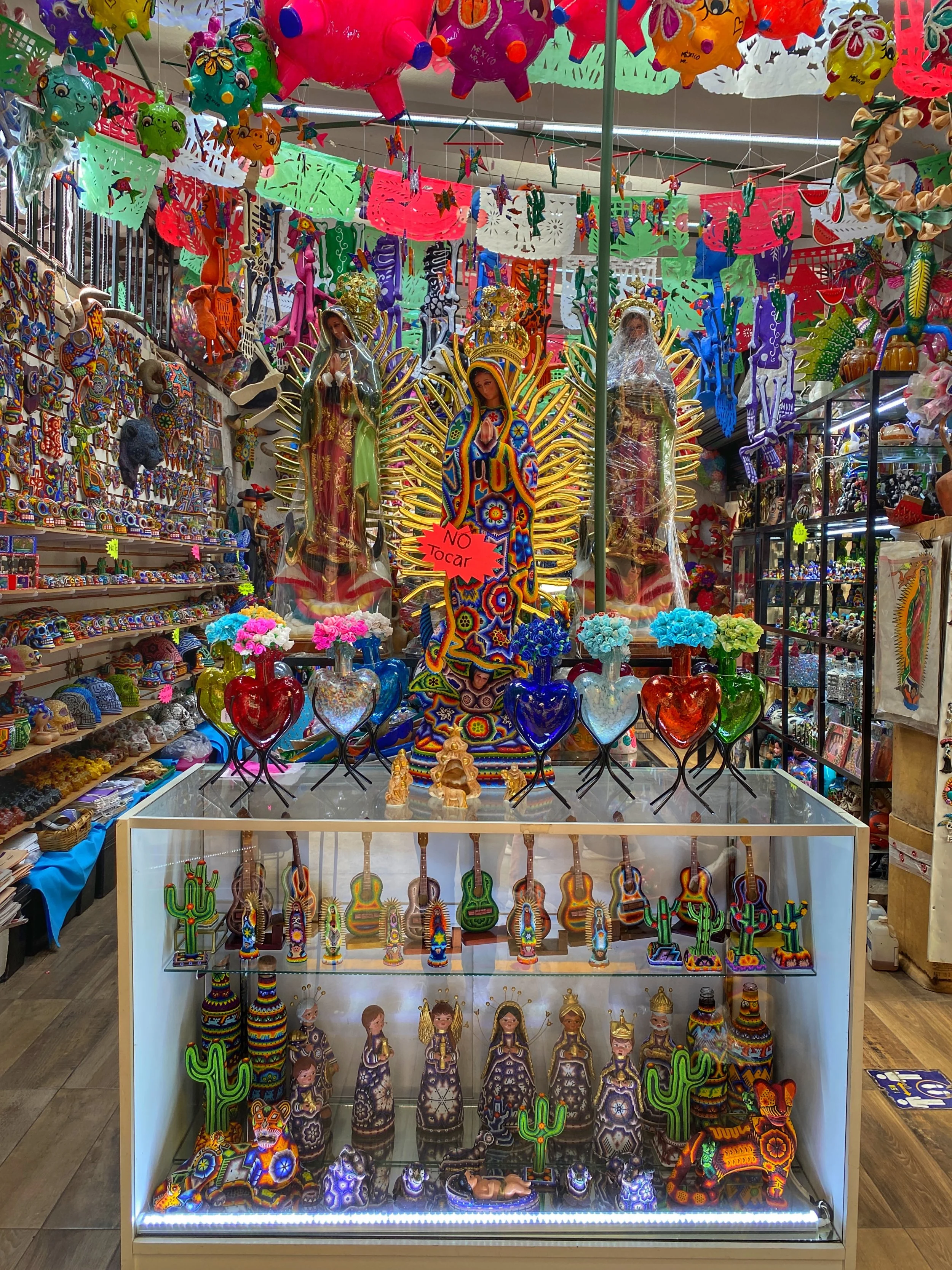 Folk art for sale at a shop in Mercado de Artesanías La Ciudadela