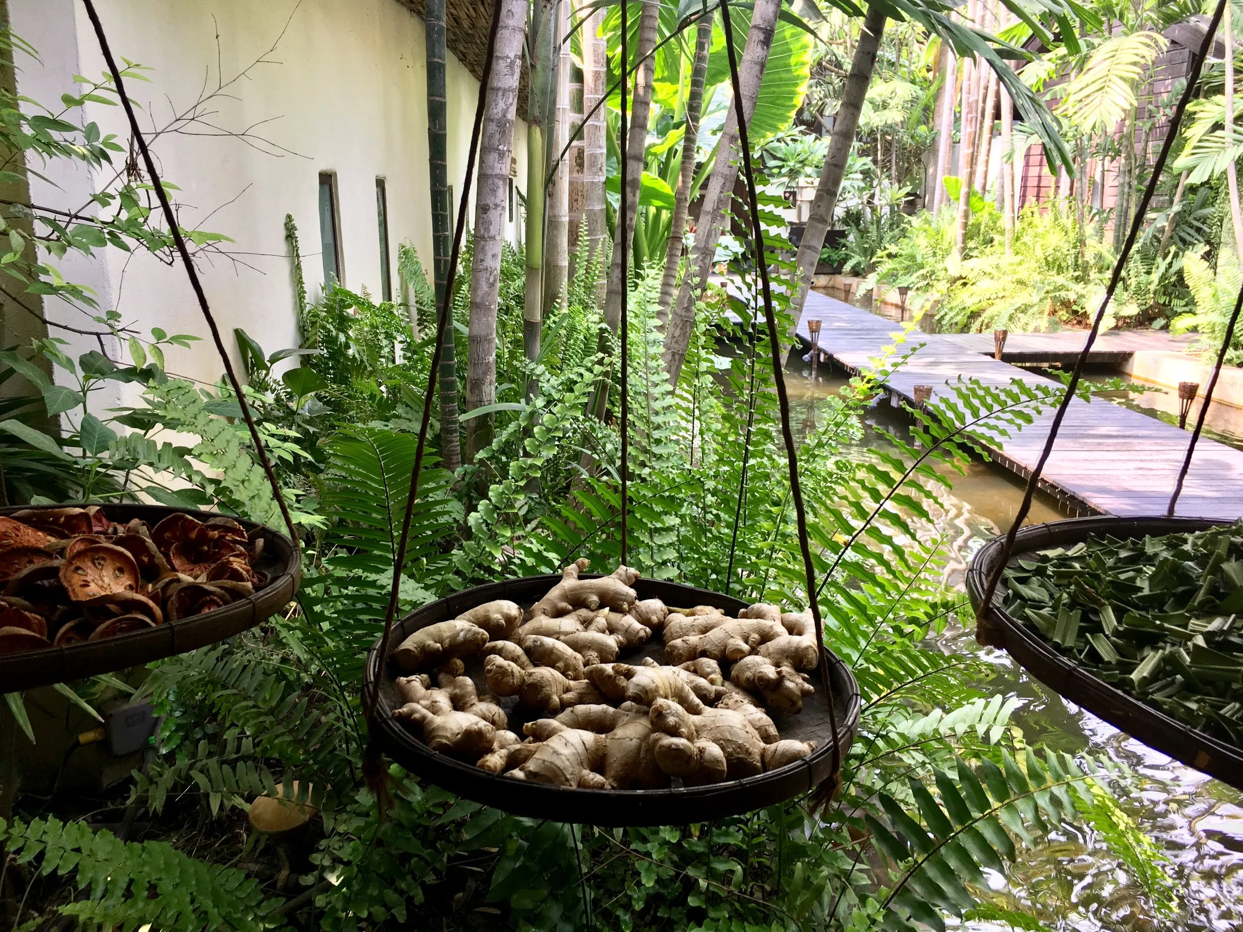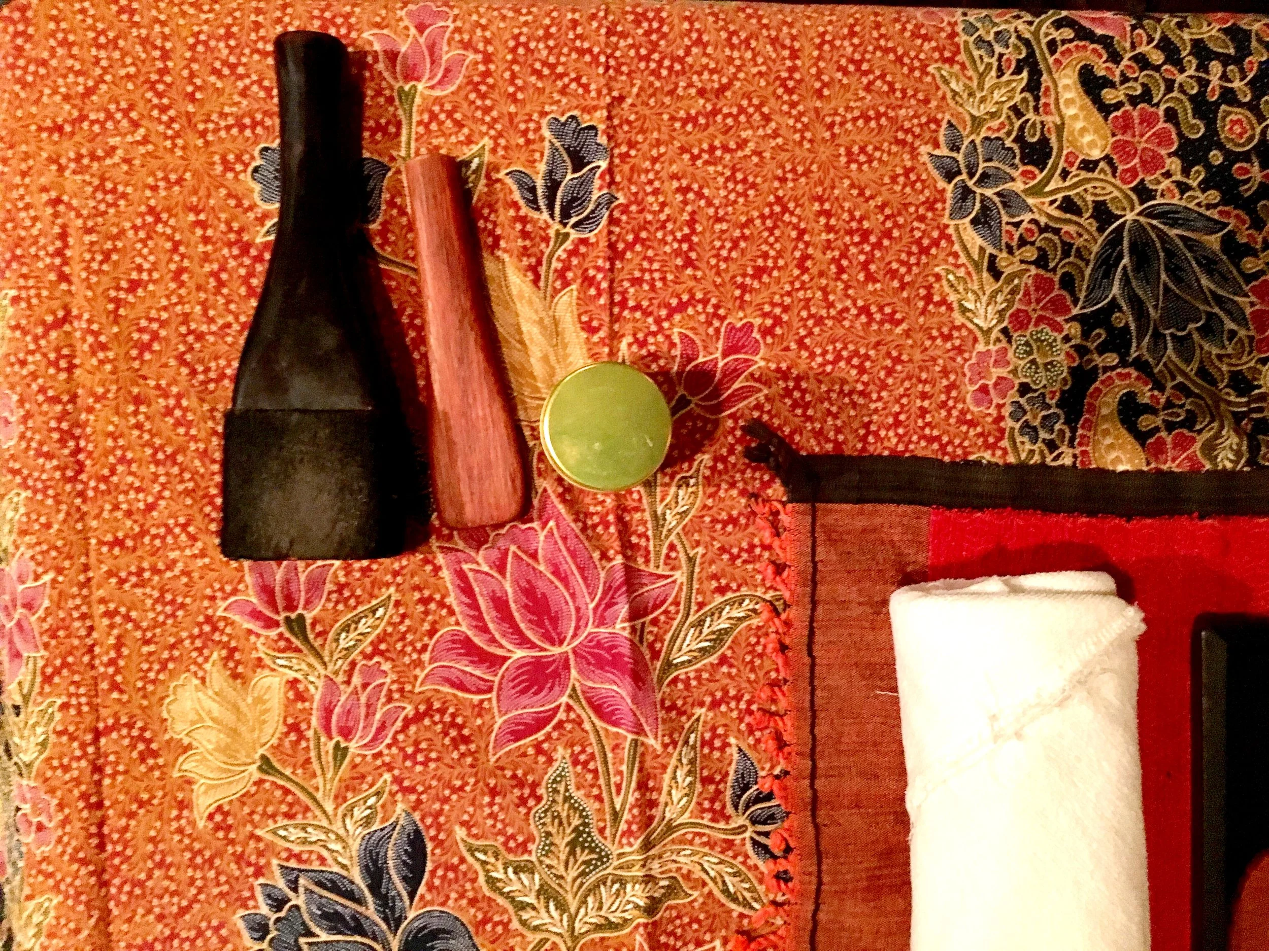 After our temazcal, we skipped the cold plunge and went into the nearby building, where we had changed out of our clothes. Now we got ready for our massages. There are so many nice touches, including a blindfold and aromatic herbs placed by our noses — both of which connected back to the temazcal experience.