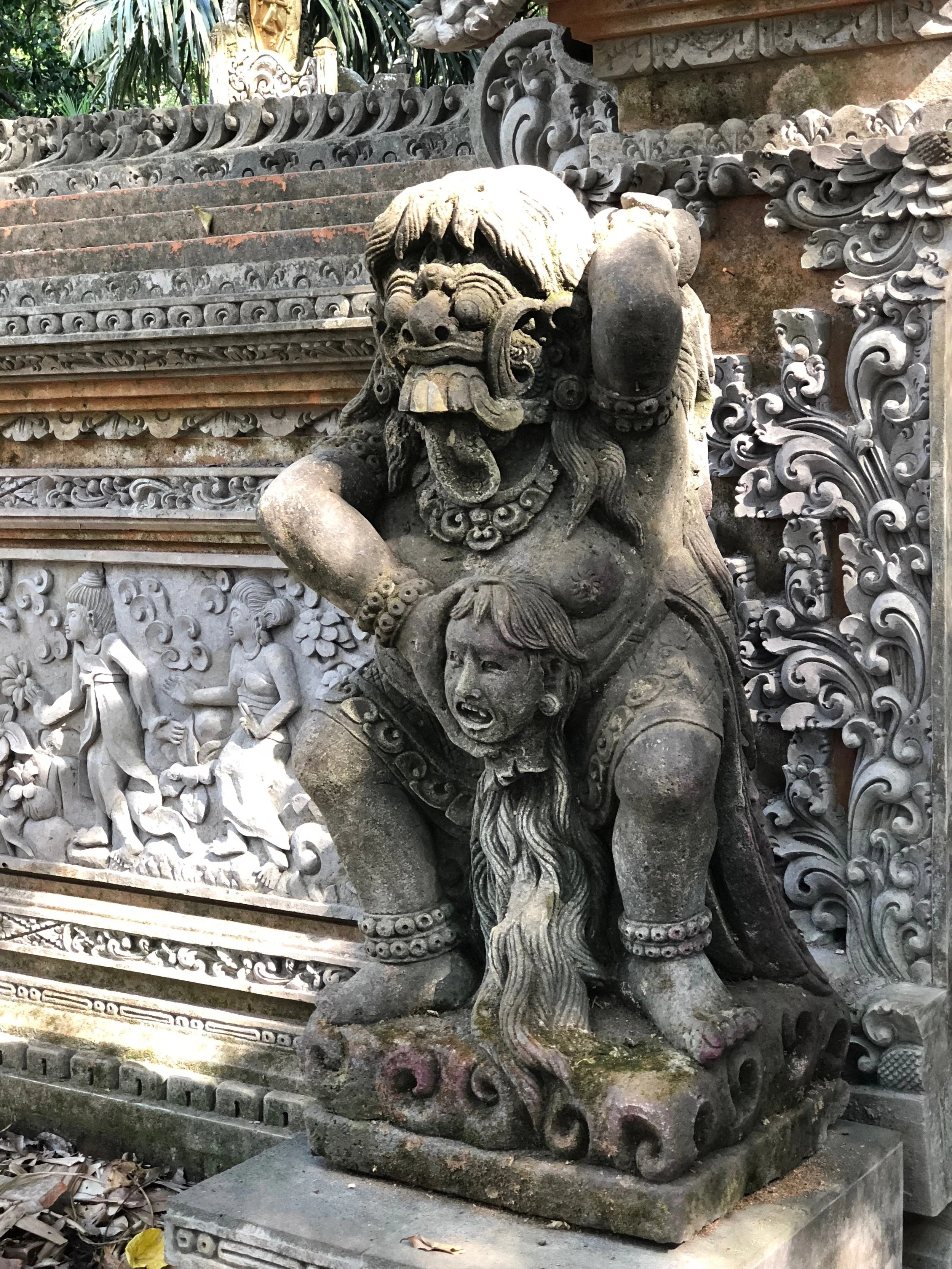 Statues in the Monkey Forest tend to be grotesque — which Duke and Wally love