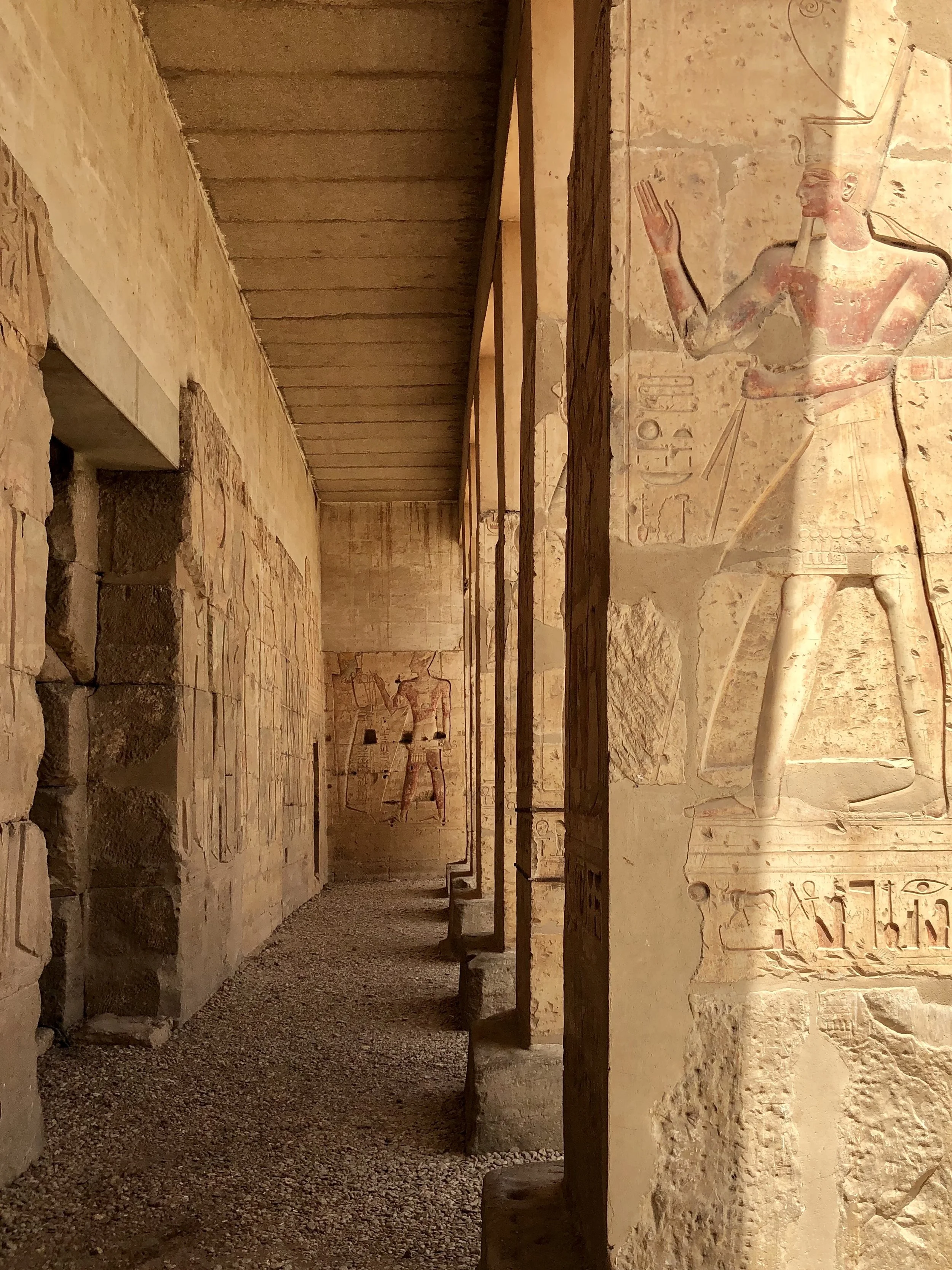 As we approached the temple, we paused on the open terrace to admire the precise horizontal and vertical symmetry of its exterior, which, like Hatshepsut’s funerary temple, feels modern in its minimalism.