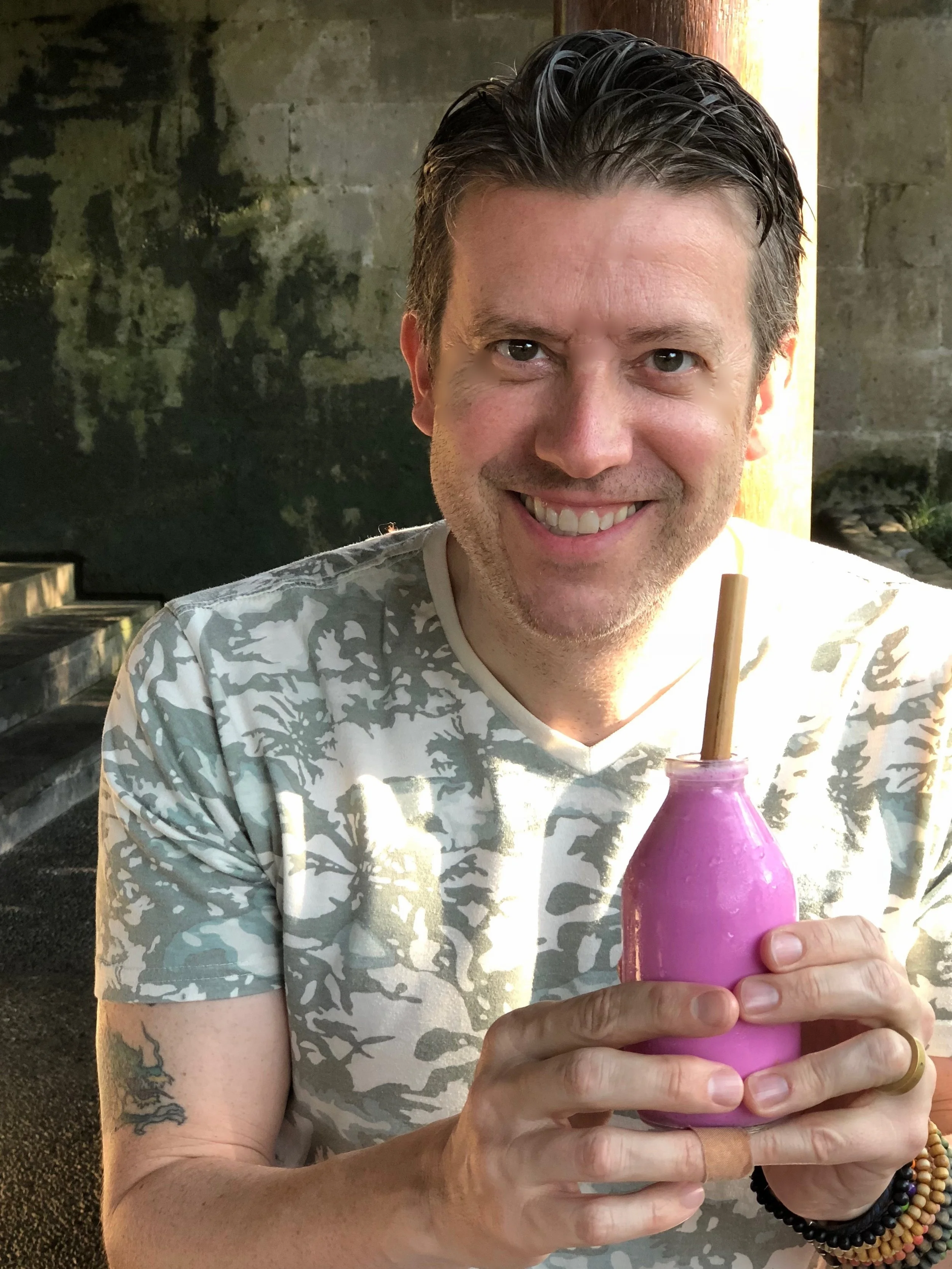 A typical breakfast at Alila: fresh baked goods, a trio of smoothies, coffee and nasi goreng (pink sunglasses Wally’s)