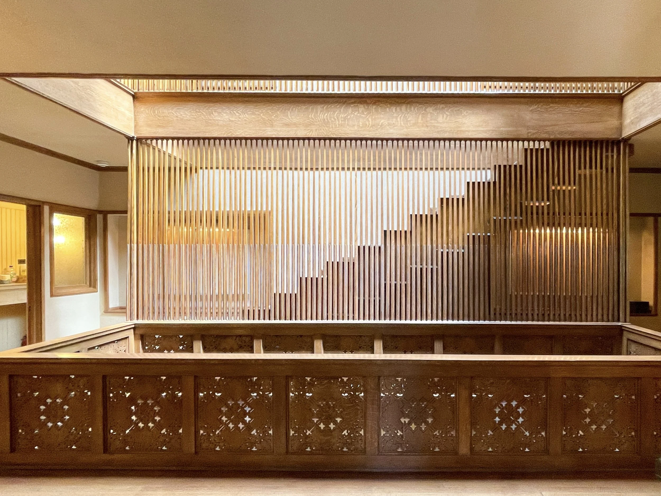 The star of the show: The amazing screen that somewhat hides the staircase is one of the elements attributed to Wright in the home’s design.