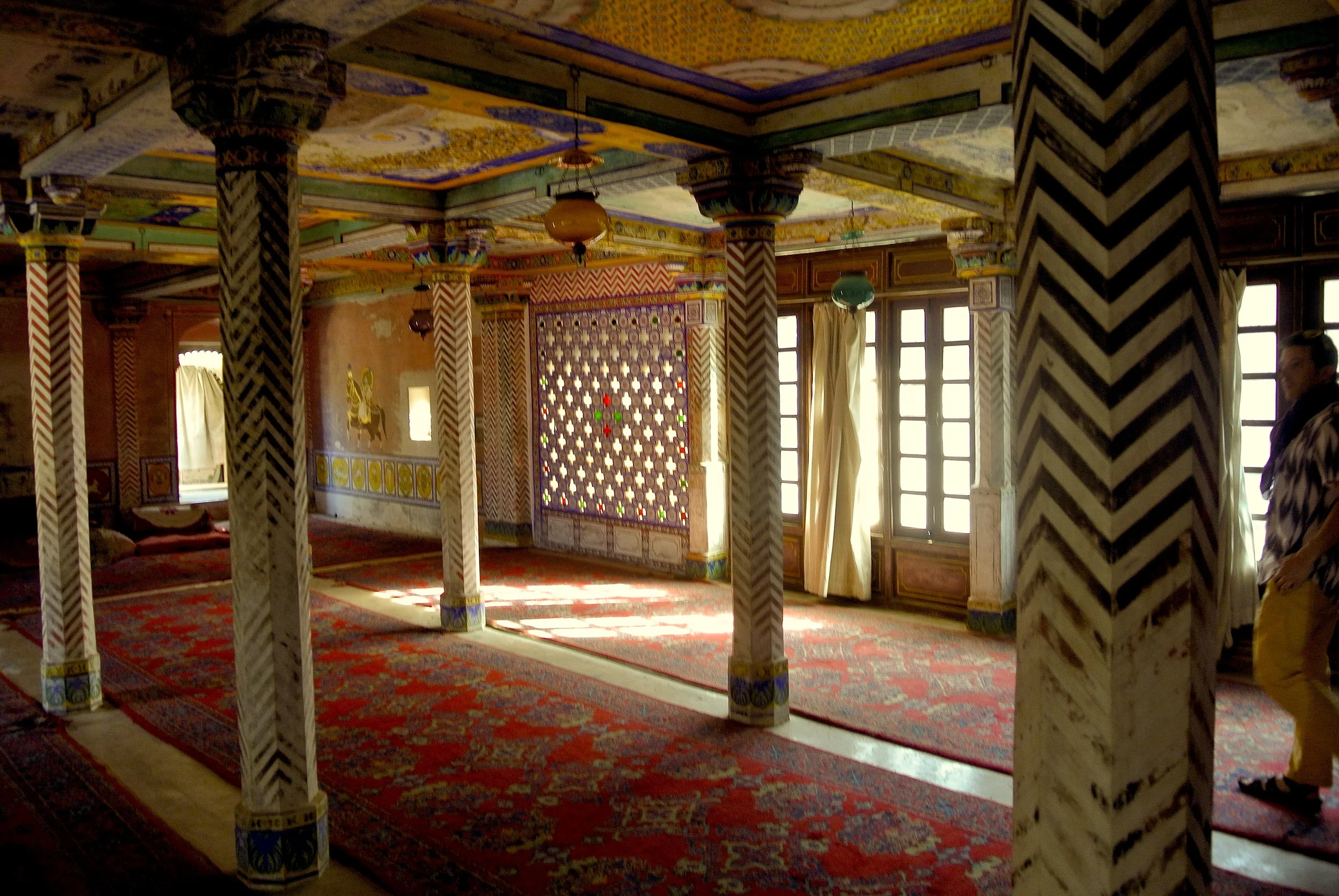 Late afternoon light streamed through the windows, lingering upon the colorful murals, frescoes and an interior apartment that contains a glass and mirror inlay.