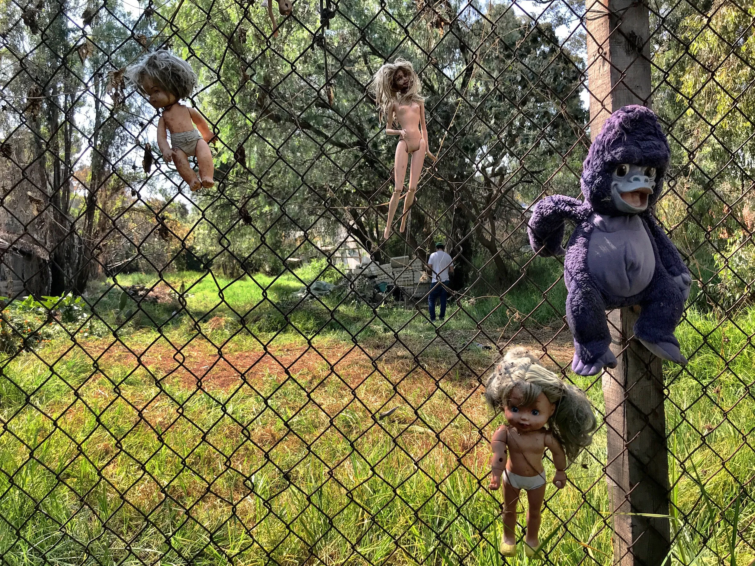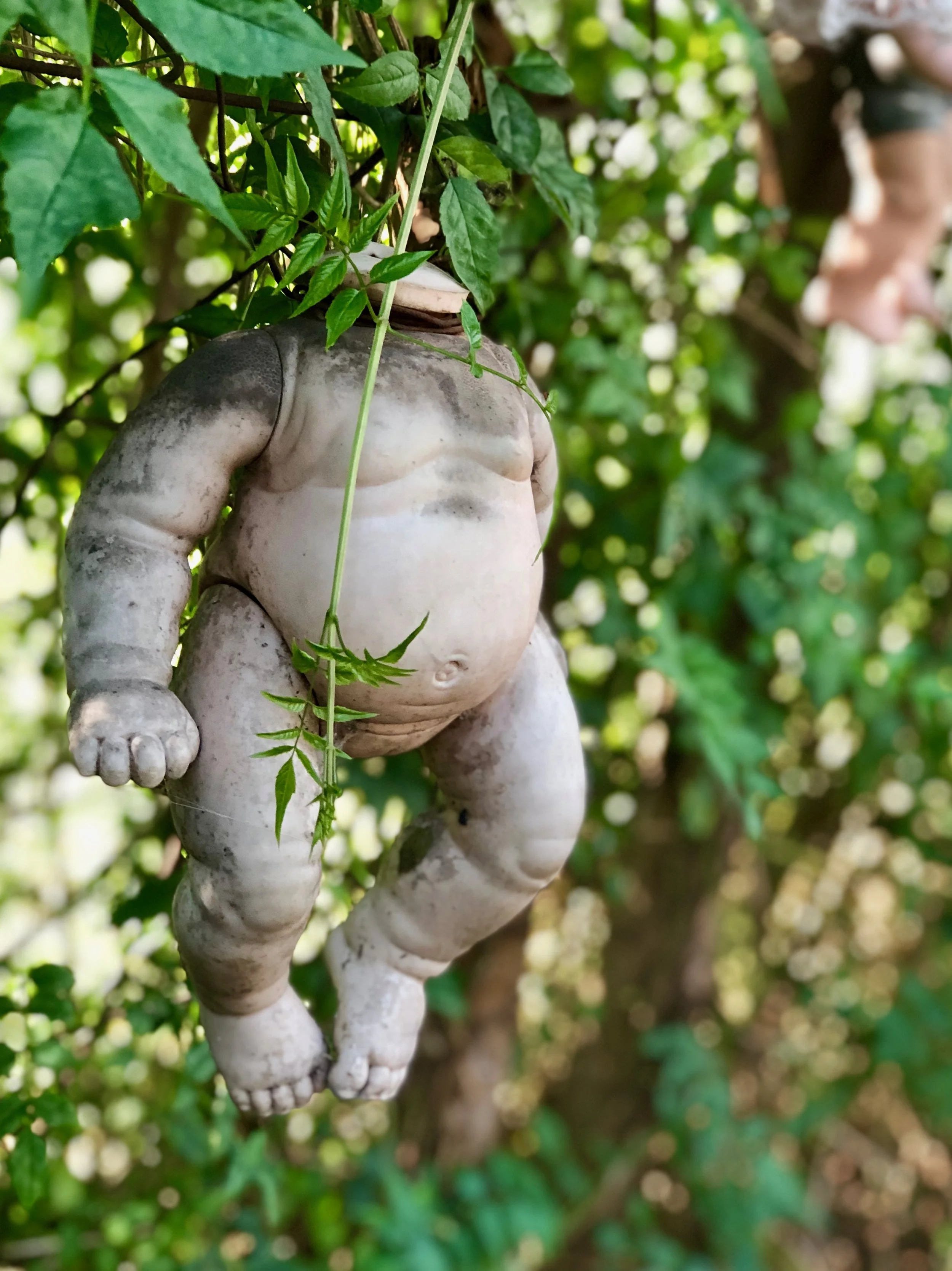 A doll hangs, missing its head, its skin a grayish hue from years of sun and rain. Another’s eye has popped out. One has been defaced, with an arcane symbol scrawled upon its forehead and a dark smudge over one of its unblinking eyes.