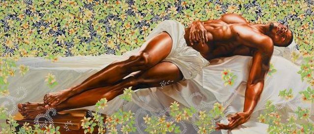 Kehinde Wiley is a contemporary African American artist known for his large-scale paintings that highlight the image and status of young urban Black men in contemporary culture by placing them in scenes that are regal and European in origin. His photorealistic compositions reinterpret classical portraiture and are often combined with layered, vivid ornamental motifs. Gazing at the monumental Death of Abel Study — it measures a whopping 11 feet high by 25 feet wide — I couldn’t help but ask myself, is the man dead, being objectified, or both?