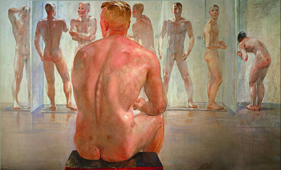 La douche, Après la bataille (Shower, After the Battle) by Alexander Deyneka was inspired by a black and white photograph of presumably nude athletes that Soviet photographer Boris Ignatovich had presented to Deyneka. It took the painter five years to complete. The provocative work depicts a group of strapping young men taking a communal shower. The muscular back of an onlooker is seen in the foreground. For me, the painting brings back high school anxieties of showering and sharing the locker room with the wrestling team. There’s a tension between heterosexual aspirations and homoerotic desire.