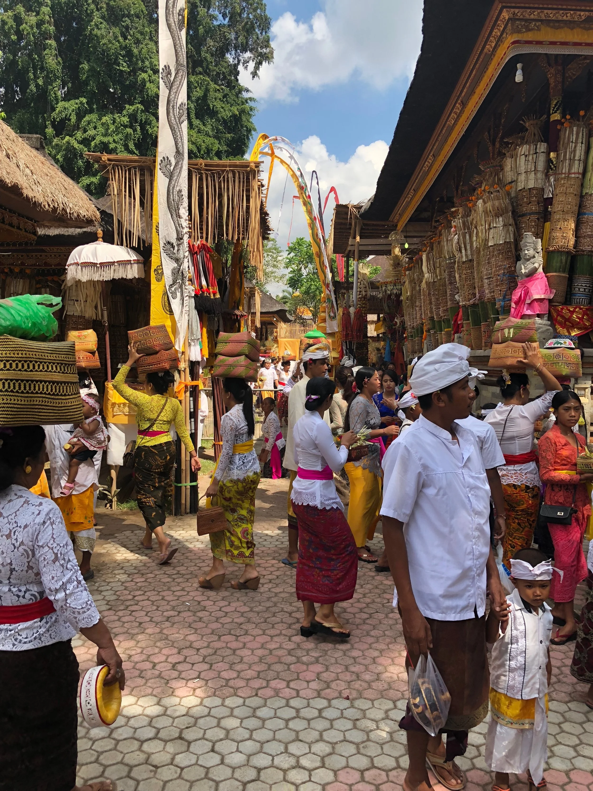 We had stumbled upon one of the oldest Hindu rituals on Bali: Siat Sampian (War of the Offerings), which takes place every 10th full moon. While we saw many crowds praying in the various courtyards, apparently we missed the battle that would take place later, when hundreds of pilgrims playfully “attack” each other, throwing arrangements called sampian, which consist of woven palm fronds pointing out like the rays of the sun.